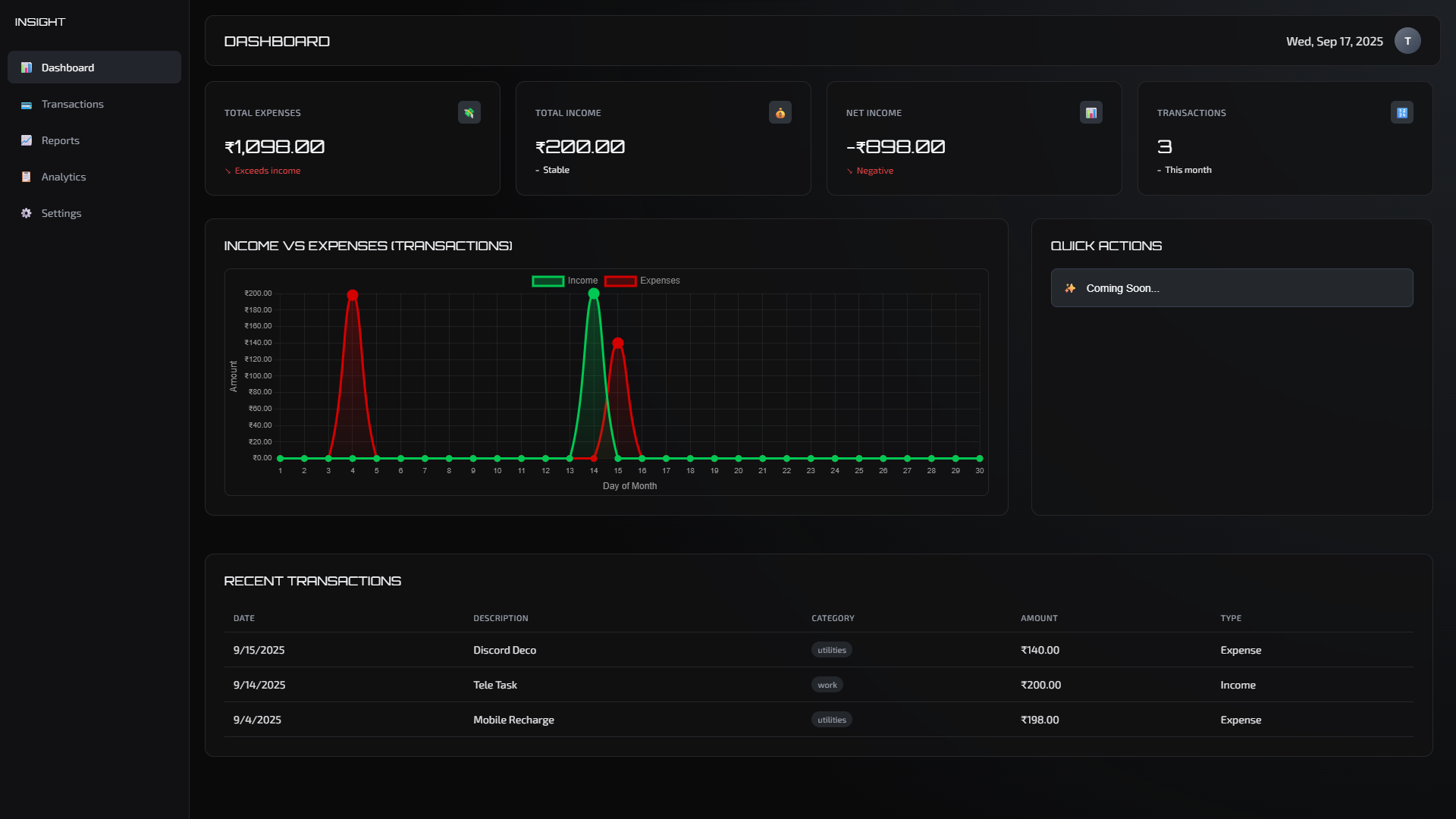 Insight Expense Tracker is a smart and intuitive financial management tool that helps users track income, monitor spending, and analyze trends with ease. Designed with simplicity and clarity in mind, it offers clean visualizations, detailed reports, and interactive charts to give users better control over their finances. Whether for personal budgeting or team expense tracking, Insight makes managing money effortless and insightful.